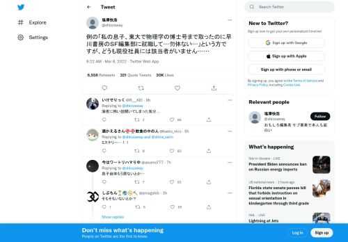 塩澤快浩さんのツイート: "例の「私の息子、東大で物理学の博士号まで取ったのに早川書房のSF編集部に就職して…勿体ない…」という方ですが、どうも現役…