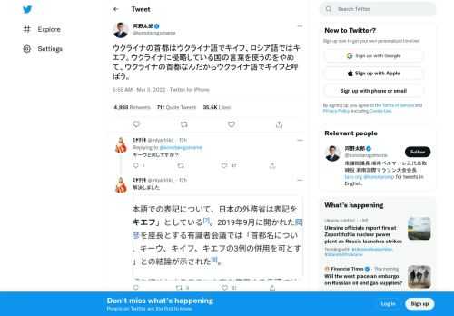 河野太郎さんのツイート: "ウクライナの首都はウクライナ語でキイフ、ロシア語ではキエフ。ウクライナに侵略している国の言葉を使うのをやめて、ウクライ…