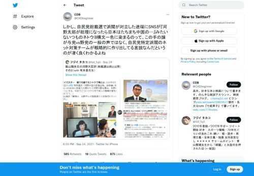 CDBさんのツイート: "しかし、自民党総裁選で派閥が対立した途端にSNSが『河野太郎が総理になったら日本はたちまち中国の…』みたいないつものネトウヨ構文…
