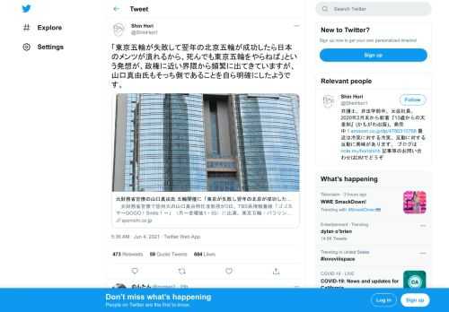 ![このまま開催に突き進んでいいのか。東京五輪の開幕まで、残り50日を切った。国際オリンピック委員会(IOC)は緊急事態宣言下でも行う方針を示し、大会組織委員会の橋本聖子会長(56)も4日の定例会見で「…]()