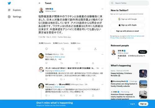 甘利 明さんのツイート: "塩野義製薬が開発中のワクチンと治療薬の治験報告に来ました。日本人対象の治験で副作用は既存薬より極めて少なく効能は他を圧し…