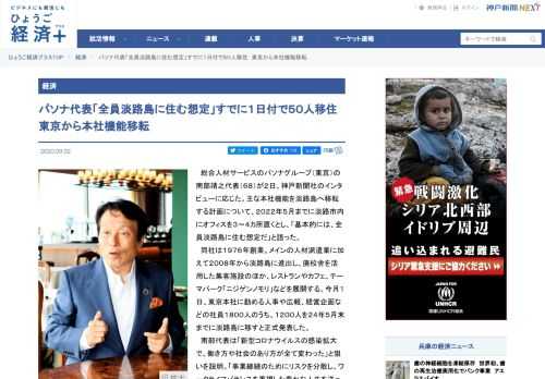 ひょうご経済+|経済|パソナ代表「全員淡路島に住む想定」すでに1日付で50人移住 東京から本社機能移転