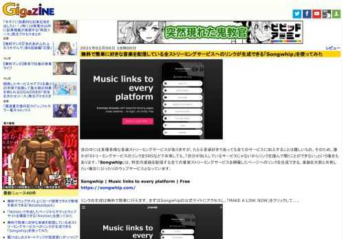 ![世の中には多種多様な音楽ストリーミングサービスがありますが、たとえ音楽好きであっても全てのサービスに加入することは難しいもの。そのため、誰かがストリーミングサービスのリンクをSNSなどで共有しても、「自分が加入しているサービスじゃないからリンクを踏んで聞くことができない」という場合もあります。「Songwhip」は、特定の楽曲を配信する全ての音楽ストリーミングサービスを網羅したページへのリンクを生成できる、楽曲を大勢と共有したい場合にぴったりのウェブサービスとなっています。]()